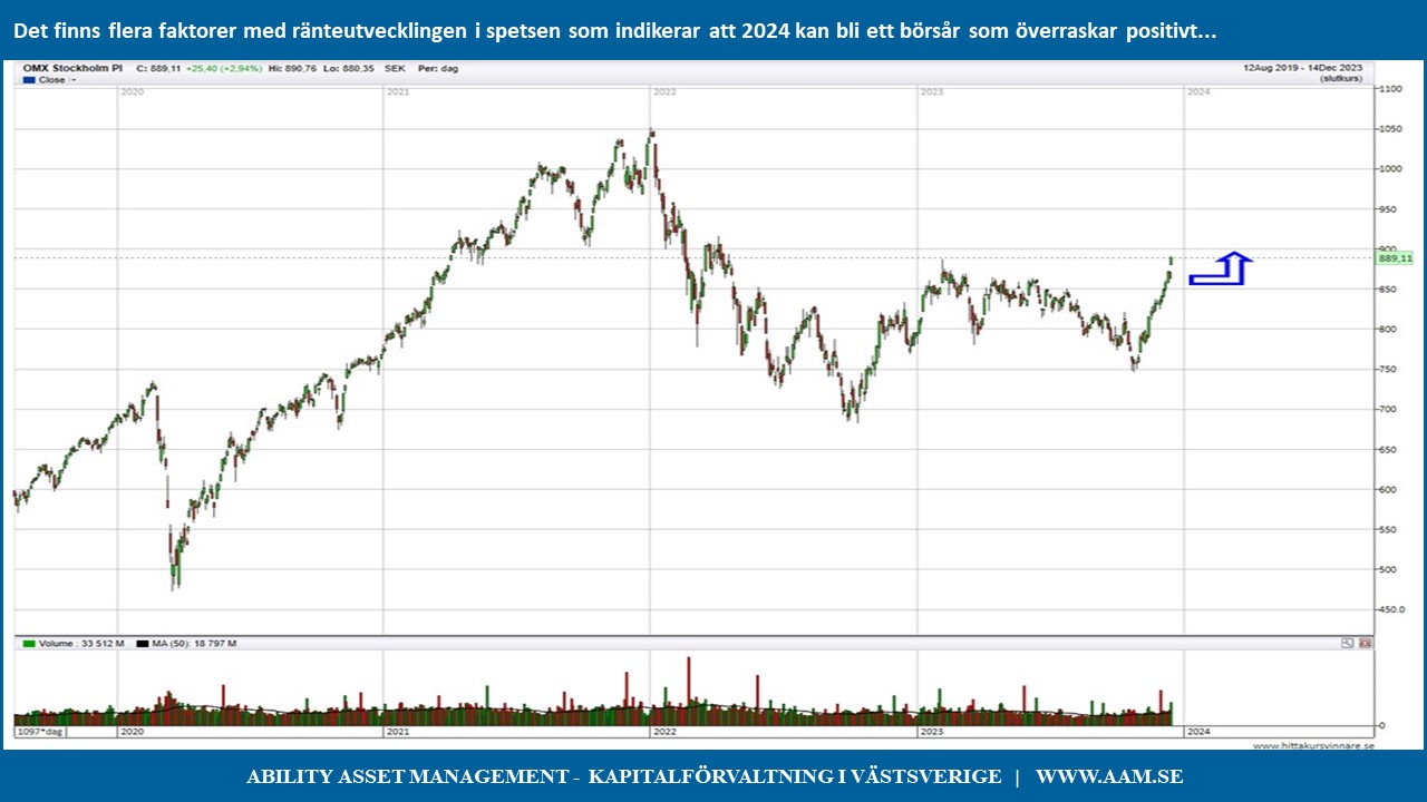 Den positiva ränteutvecklingen, den ökande sannolikheten för ekonomisk mjuklandning och marknadens underliggande styrka talar dock för att 2024 kan bli ett börsår som överraskar på uppsidan.