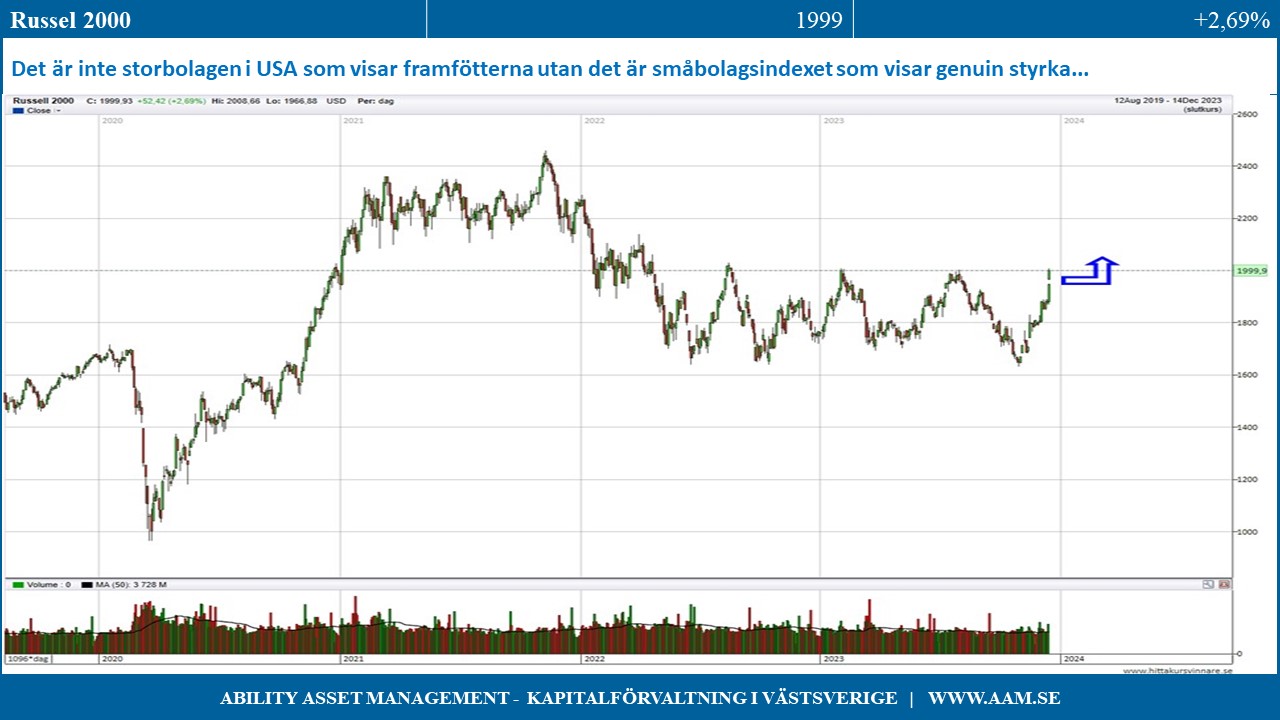 Trenden för S&P 500 och Nasdaq är tydligt uppåt och om det inte inträffar en rekyl efter onsdagens glädjebesked från Jerome Powell, så behövs det åtminstone en paus och konsolidering som gör att den underliggande positiva trenden får en mer rimlig och uthållig lutning. Det är inte storbolagen i USA som visar framfötterna utan det är småbolagsindexet Russel 2000 som visar genuin styrka med en uppgång på 3,45% under onsdagen och med 2,72% under gårdagen medan S&P 500 och Nasdaq under torsdagen bara avancerade med 0,26 respektive 0,17%.