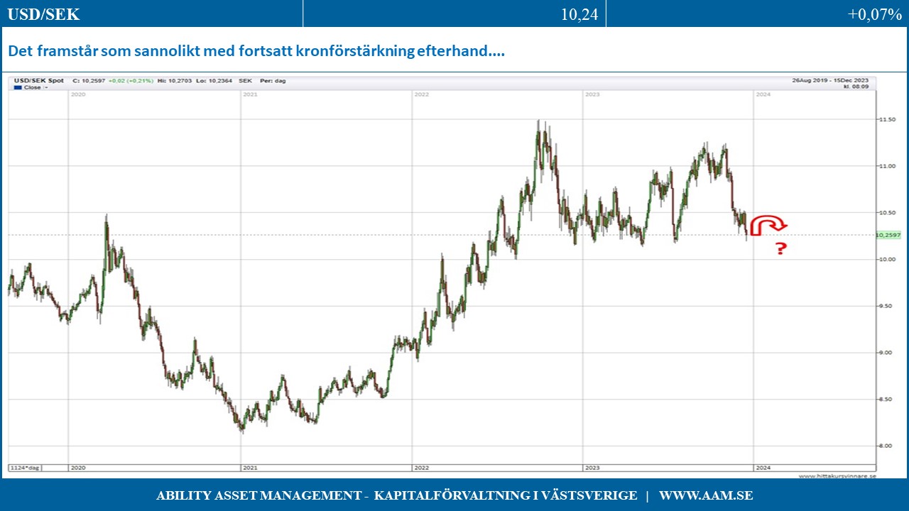 För en svensk placerare är kronförstärkningen problematisk vid placeringar i amerikanska aktier, då kronan mot den amerikanska dollarn stärkts från 11,23 i början av november till som lägst 10,19 under gårdagen och det ser ut som att kronförsvagningen befinner sig i en långsiktig ”toppformation” som efterhand gör fortsatt kronförstärkning sannolik.
