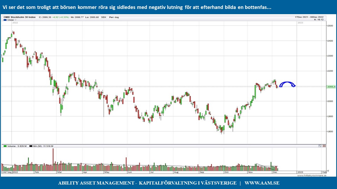 Det är möjligt att det kan ske ett nytt försök till trendbrott, men detta framstår som mindre sannolikt. Vi ser det som mer troligt att marknaden kommer röra sig sidledes med en negativ lutning för att efterhand bilda en bottenfas från vilken det under 2023 kan ske ett avstamp för en varaktig börsuppgång.