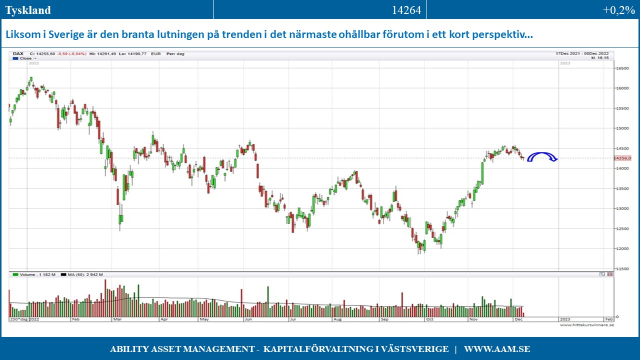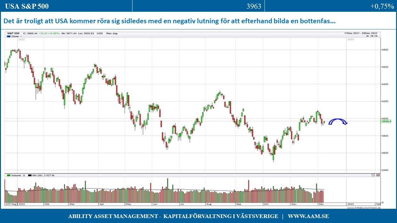 Det positiva scenariot är en stabil och sidledes börs som gör på stället marsch. Det negativet scenariot är en kännbar nedgångsfas mot årets bottennoteringar. Som för USA (S&P 500) ser vi det som troligt att börsen kommer röra sig sidledes med negativ lutning för att efterhand bilda en bottenfas från vilken det under 2023 finns god sannolikhet till ett avstamp för en långvarig och substantiell börsuppgång.