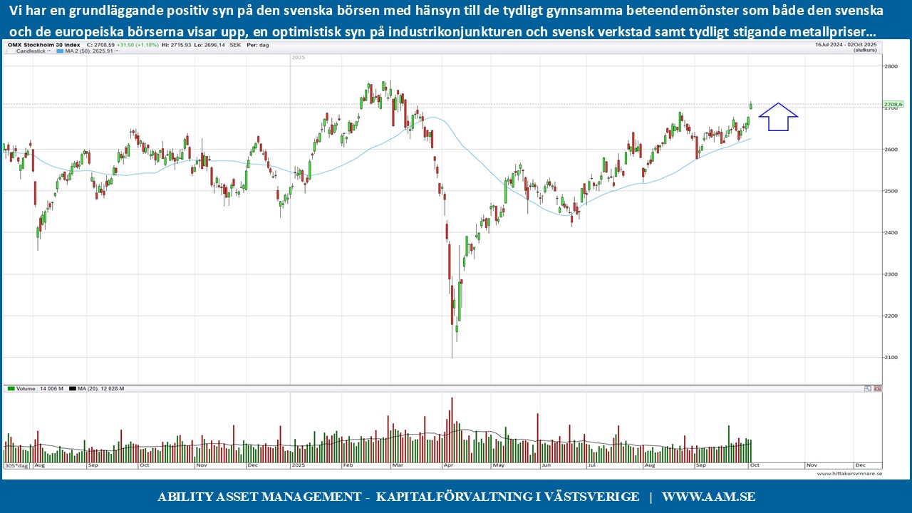 Vi har en grundläggande positiv syn på den svenska börsen med hänsyn till de tydligt gynnsamma beteendemönster som både den svenska och de europeiska börserna visar upp. En optimistisk syn på industrikonjunkturen och de svenska stora verkstadsbolagen samt tydligt stigande metallpriser ger understöd till denna positiva hållning.