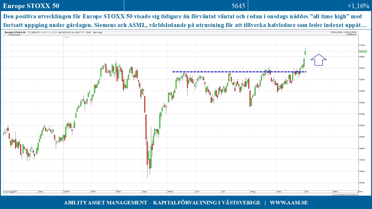 Denna positiva utveckling visade sig tidigare än väntat och redan i onsdags nåddes ”all time high” med fortsatt uppgång under gårdagen. Siemens har bidragit till denna utveckling med det är främst det holländska bolaget ASML, som är världsledande på utrustning för att tillverka halvledare som leder Europe STOXX 50 uppåt.