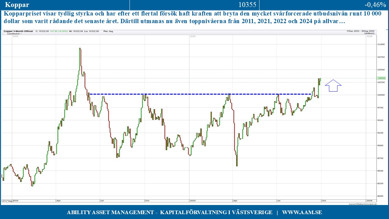 För den svenska cykliska och verkstadsdominerade börsen är det klart positivt att kopparpriset (se diagram) visar tydlig styrka och efter ett flertal försök haft kraften att bryta den mycket svårforcerade utbudsnivån runt 10 000 dollar som varit rådande det senaste året. Adderar vi därtill att även toppnivåerna från 2011, 2021, 2022 och 2024 nu utmanas på allvar och att aluminium, bly och zink också visar positiva tendenser ger detta stöd till ovan nämnda optimistiska syn på industrikonjunkturen.