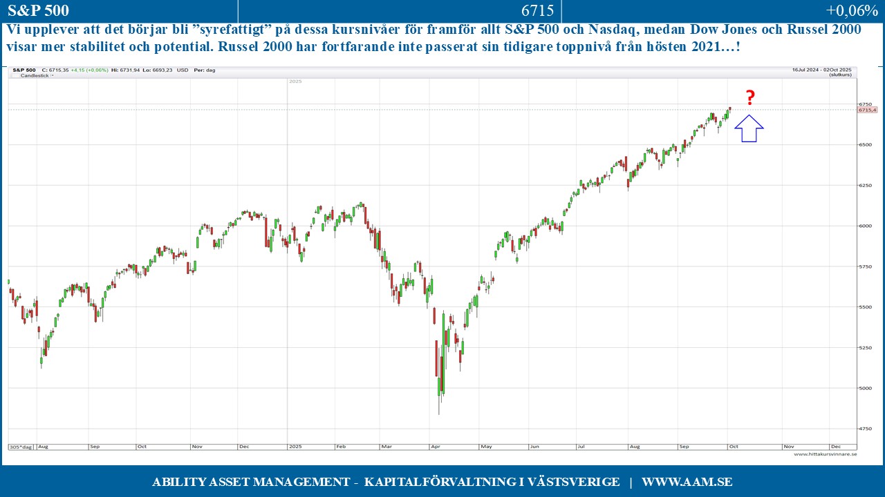 Alla de amerikanska indexen dvs. den breda marknaden, S&P 500, teknologibolagsorienterade Nasdaq, värdebolagsorienterade Dow Jones och småbolagsindexet Russel 2000 befinner sig i positiva trender. Vi upplever dock att det börjar bli ”syrefattigt” på dessa kursnivåer för framför allt S&P 500 och Nasdaq, medan Dow Jones och Russel 2000 visar mer stabilitet och potential.