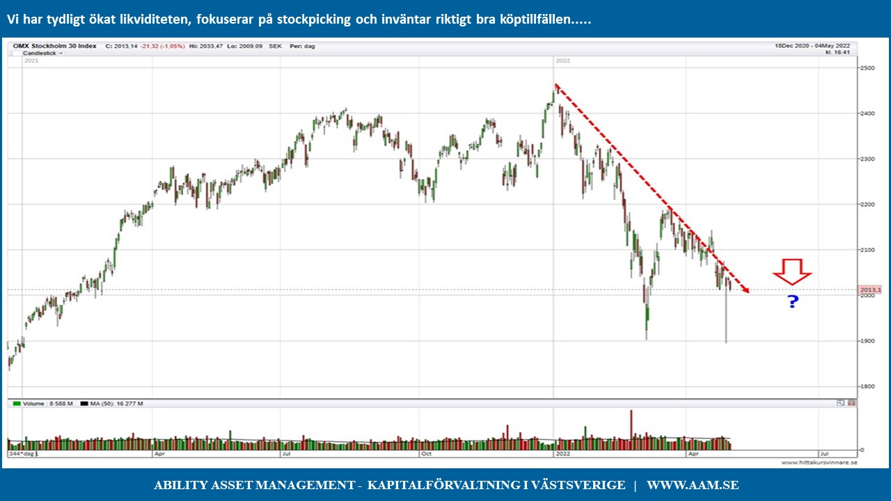 Vi skrev föregående vecka att en marknad behöver kraft för att stiga, men kan falla av sin egen tyngd och med hänsyn till den svaga utvecklingen i USA, ljummen respons på rapportperioden i Sverige, ännu mer latent utbud på ovansidan, ökad handelsvolym på negativa dagar, markant stigande långräntor och ett ogynnsamt säsongsmönster i antågande såg vi ökad risk för negativ kursutveckling på den svenska börsen (OMXS30). Vi hade därför tydligt ökat likviditeten, fokuserade på stockpicking och inväntade de riktigt bra köptillfällen, som efterhand kommer att utkristalliseras på börsen.