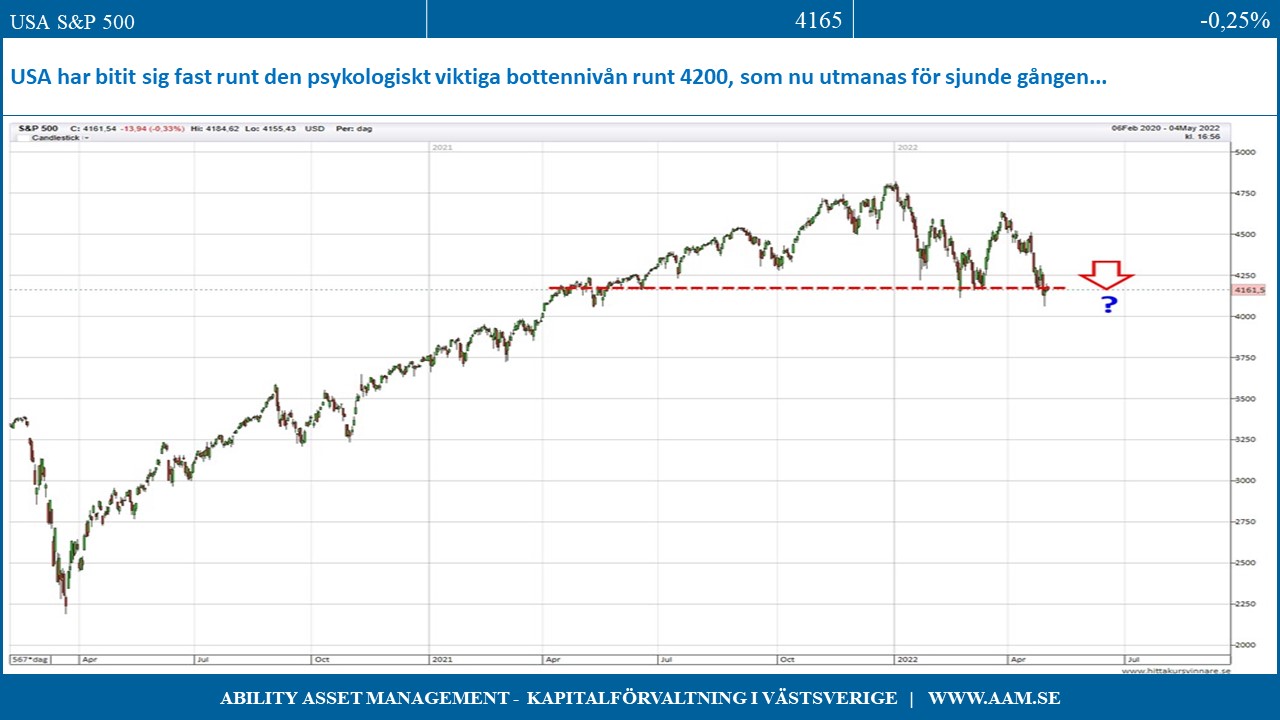 S&P 500 har under ett helt år rört sig sidledes, befinner sig på samma nivå som april 2021 och har bitit sig fast runt den psykologiskt mycket viktiga bottennivån runt 4200 punkter, som nu utmanas för sjunde gången.