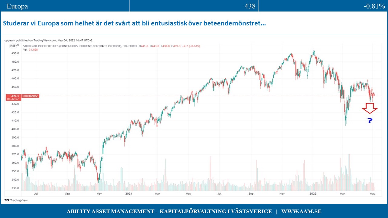 Studerar vi Europa som helhet är det svårt att bli entusiastisk över beteendemönstret. Även här ligger index på samma nivå som för ett år sedan men marknaden är mer stabil jämfört med USA och risken för kursfall mindre överhängande även om korrelationen med börsutvecklingen i USA inte ska underskattas.