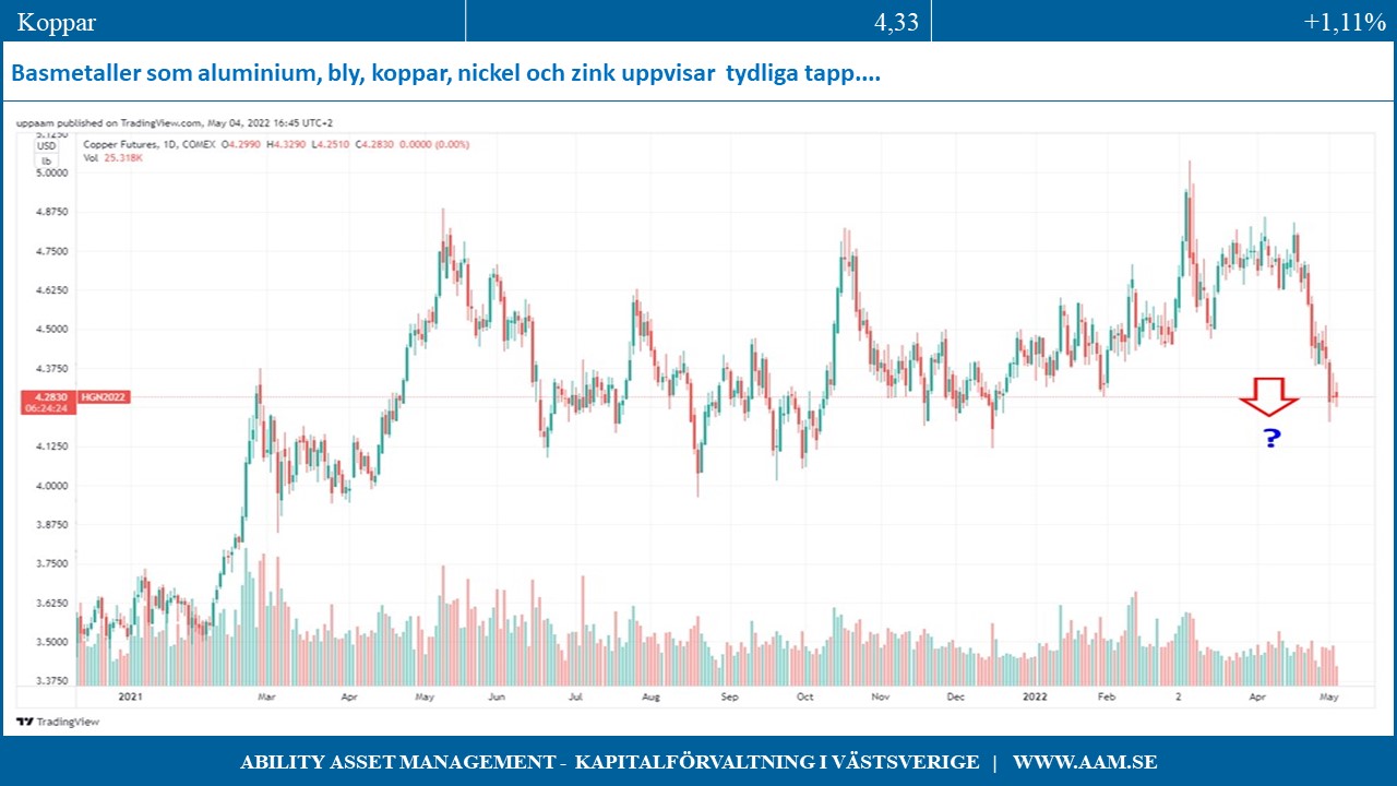 Oljepriset har stabiliserats över 100 dollar men basmetaller som aluminium, bly, koppar, nickel och zink uppvisar i flera fall tydliga tapp i samklang med minskad ekonomisk aktivitet i Kina och råvaruaktier som t.ex. Boliden och Lundin Mining som nyligen var ”heta” har den senaste tiden tappat runt 20% vardera.