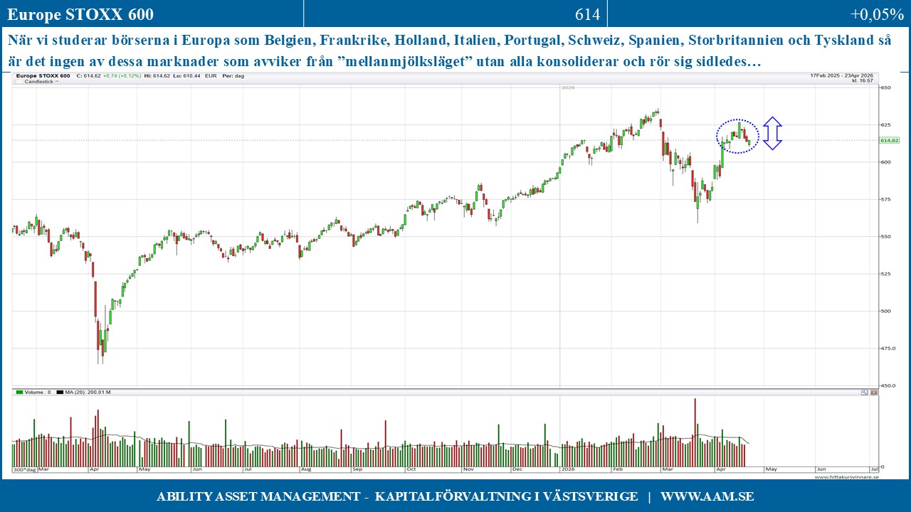 När vi studerar börserna i Europa som Belgien, Frankrike, Holland, Italien, Portugal, Schweiz, Spanien, Storbritannien och Tyskland så är det ingen av dessa marknader som avviker från mellanmjölksläget utan alla konsoliderar och rör sig sidledes efter den kraftfulla uppgången under första hälften av april.