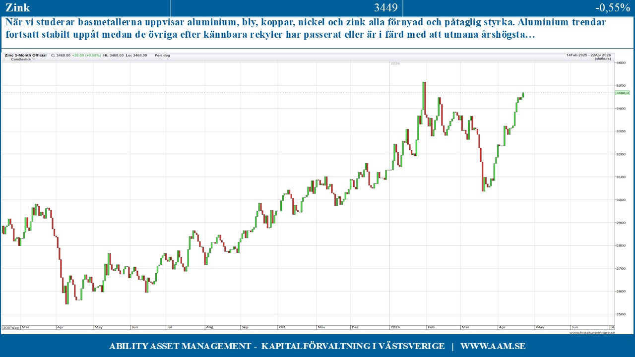 När vi studerar basmetallerna uppvisar aluminium, bly, koppar, nickel och zink alla förnyad och påtaglig styrka. Aluminium trendar fortsatt stabilt uppåt medan de övriga efter kännbara rekyler har passerat eller är i färd med att utmana årshögsta och denna styrka borde snart börja visa sig hos den svenska börsens råvarukänsliga bolag.