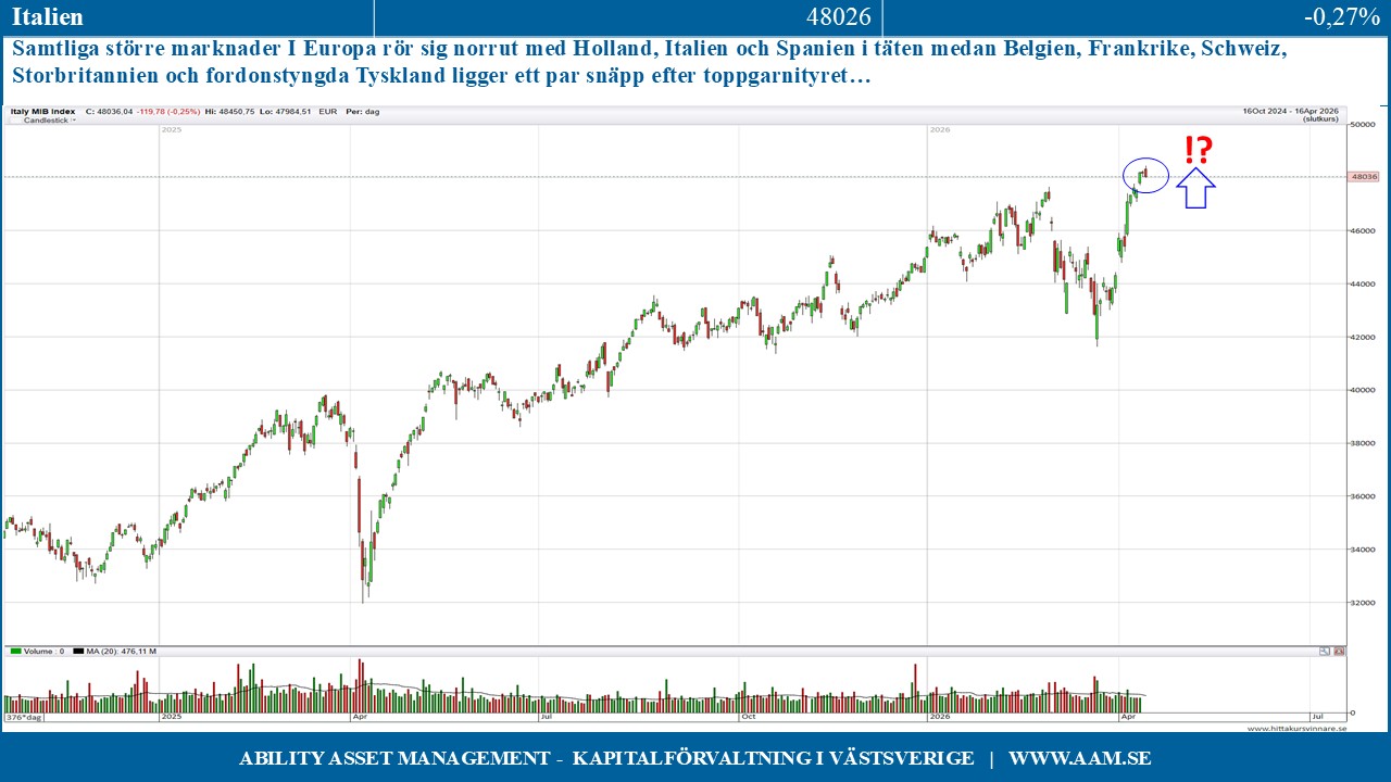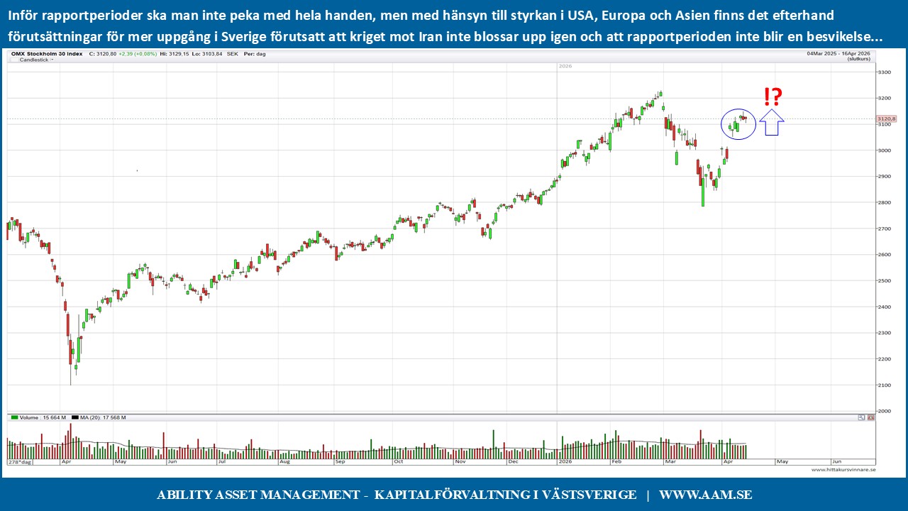 Inför rapportperioder ska man inte peka med hela handen avseende den troliga börsutvecklingen, men med hänsyn till den styrka som USA, Europa och Asien uppvisat finns det efterhand förutsättningar för vidare uppgång i Sverige förutsatt, som vi skriver ovan, att kriget mot Iran inte blossar upp igen och att den påbörjade rapportperioden inte blir en besvikelse.