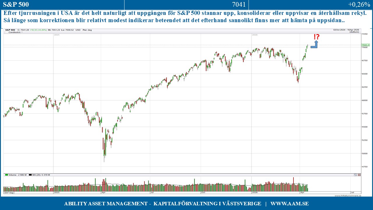 Efter denna tjurrusning på ovansidan är det synnerligen naturligt att uppgången för S&P 500 och teknologiorienterade Nasdaq stannar upp, tar en paus, konsoliderar eller uppvisar en återhållsam rekyl.  Så länge som korrektionen blir relativt modest indikerar beteendet att det efterhand finns mer att hämta på uppsidan. De självklara brasklapparna är att kriget mot Iran inte blossar upp igen och att den påbörjade rapportperioden inte blir en besvikelse.