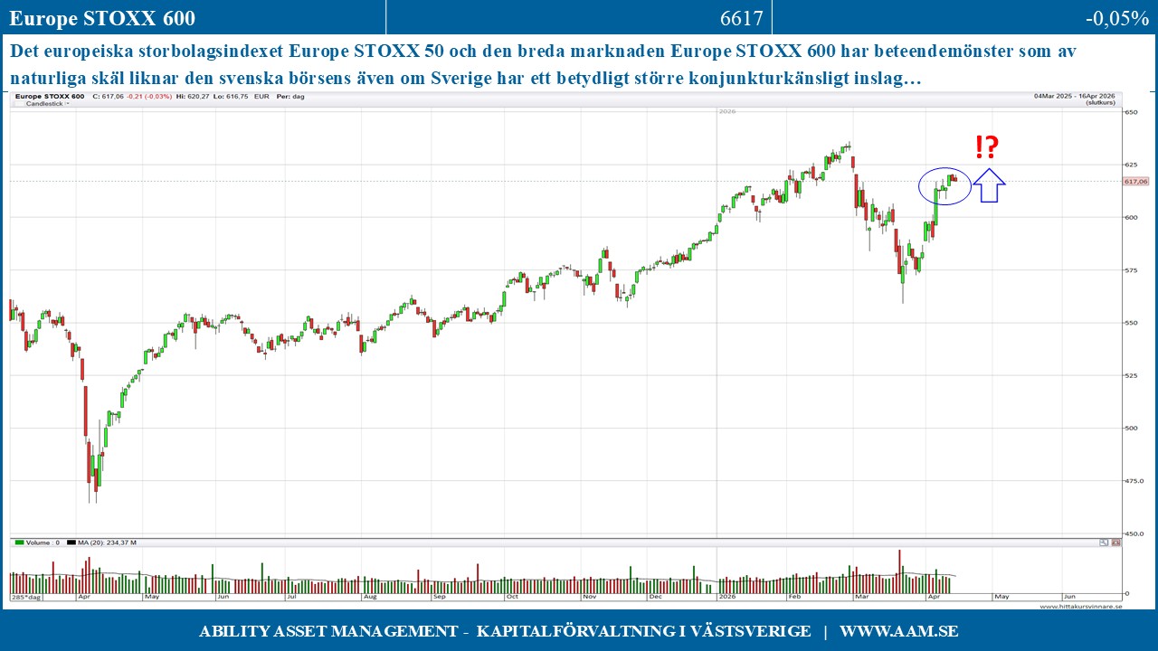Det europeiska storbolagsindexet Europe STOXX 50 och den breda marknaden Europe STOXX 600 har beteendemönster som av naturliga skäl liknar den svenska börsens även om Sverige har ett betydligt större konjunkturkänsligt inslag.