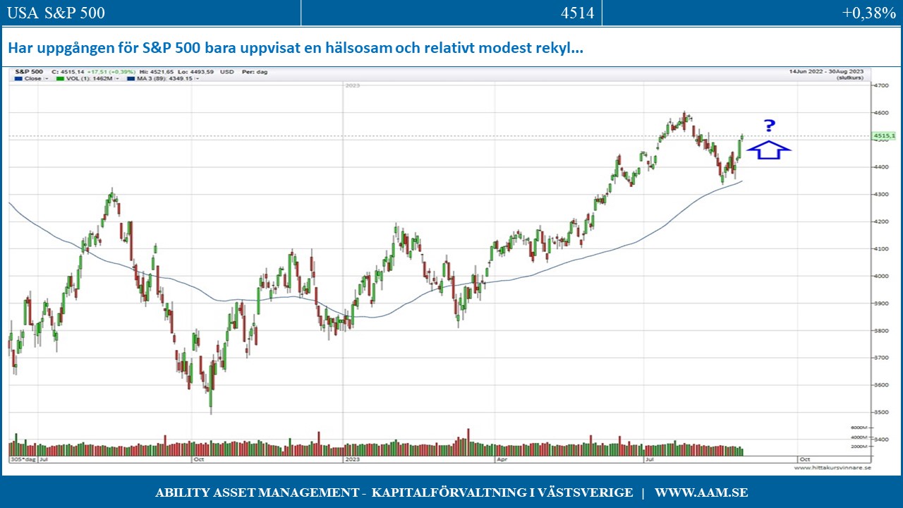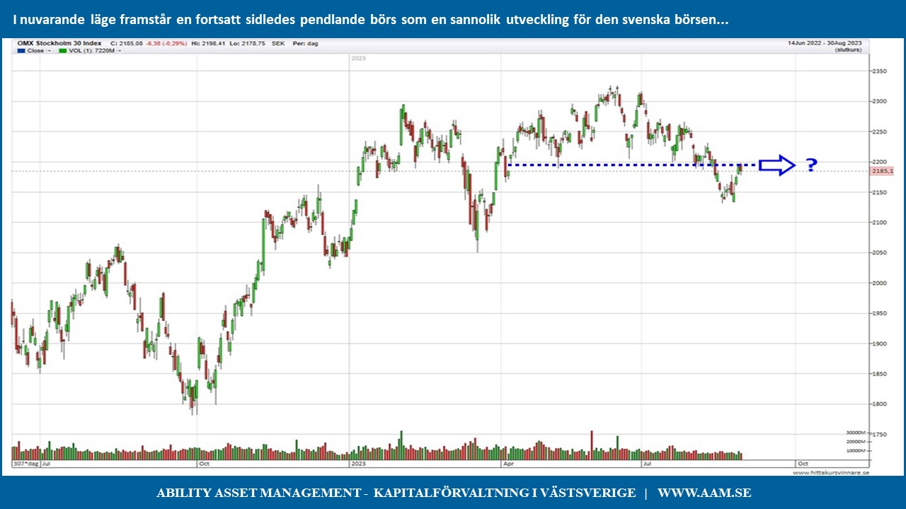 I Sverige bröts däremot både storbolagsindex och den breda marknaden nedåt från sina intervall i mitten av denna månad, men då USA och Europa visat positiva tendenser respektive stabilitet med en lugnare ränteutveckling så har nedgången avstannat. Nu försöker den svenska börsen att arbeta sig upp och tillbaka in sitt tidigare tradingintervall. Detta kan mycket väl lyckas, men det kommer knappast ske utan besvär eftersom det nu finns ett betydande latent utbud strax ovanför nuvarande indexnivåer.