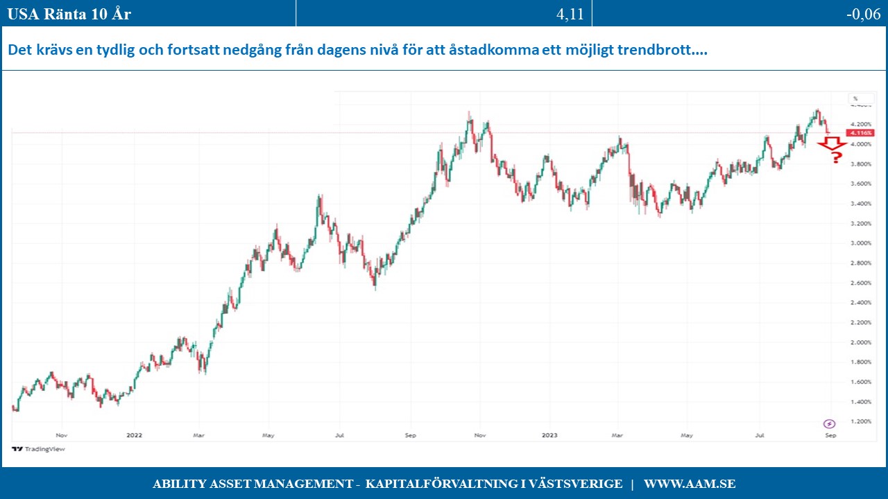 Utvecklingen för långräntorna såg nyligen klart oroväckande ut. Sedan början av maj månad har den amerikanska tioåringen stigit från 3,4% till som mest 4,35%, vilket innebar att toppnoteringen från oktober 2022 utmanades. En snarlik rörelse har skett i Europa och i Sverige nåddes årshögsta med marginal. Därefter har vi framförallt i USA fått se en rekyl från dessa höga nivåer baserat på indikationer om avtagande inflation. Den uppåtriktade räntetendensen från sommaren är dock fortfarande intakt och det krävs en tydlig och fortsatt nedgång från dagens nivå för att åstadkomma ett möjligt trendbrott.