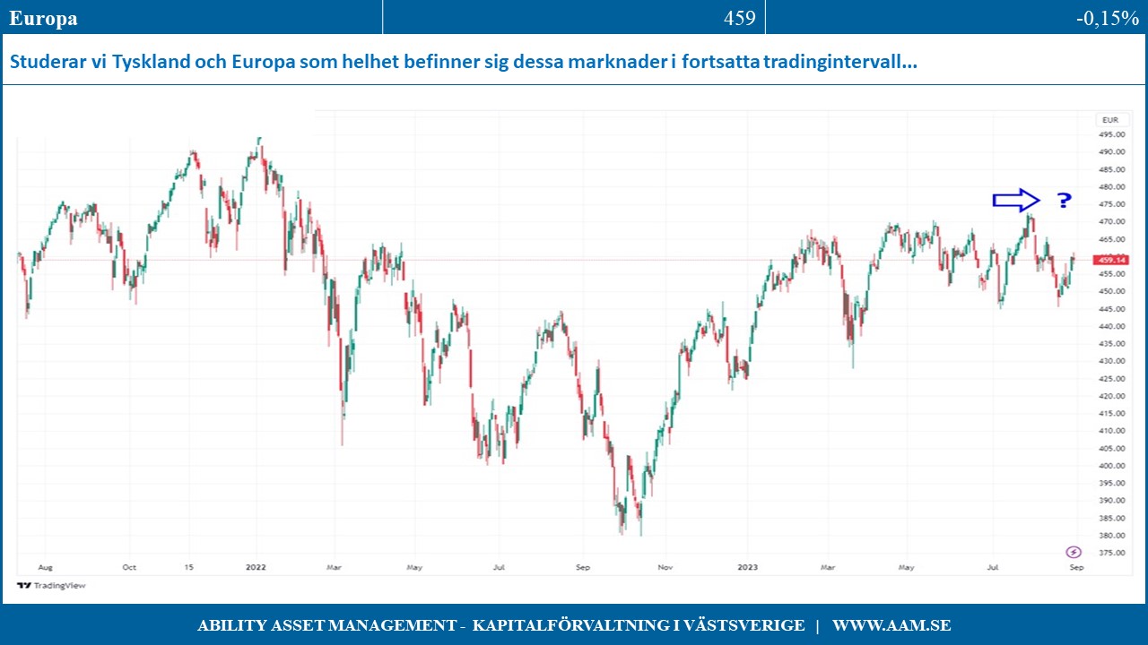 Studerar vi Tyskland och Europa som helhet befinner sig dessa marknader i fortsatta tradingintervall, men till skillnad från Sverige så har dessa intervall inte brutits på nedsidan utan de uppvisar mer stabilitet om än ingen tydlig tendens.
