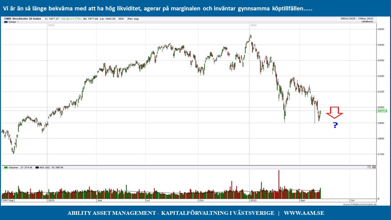 Risken för vidare nedgång i USA ligger dock som en våt filt över marknaden och vi är än så länge bekväma med att ha hög likviditet och agera på marginalen. Det kommer efterhand att uppstå mycket gynnsamma köplägen och vi vill vara väl förberedda med goda resurser att kunna nyttja ett sådant börsläge i mesta möjliga grad.