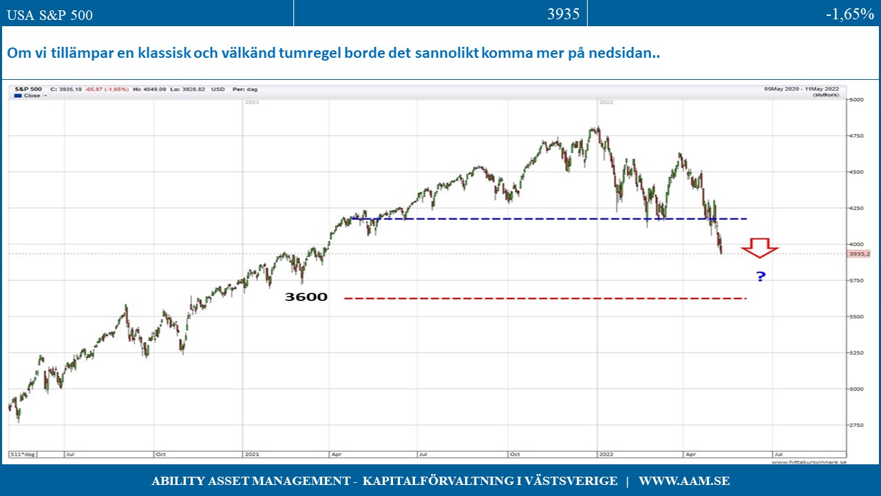 Vid ett negativt (nedåtriktat) utbrott från en så långvarig toppformation (tradingintervall) som den för S&P 500 är det osannolikt att nedgången redan skulle vara över vid indexnivån 4000 punkter. Om vi tillämpar en klassisk och välkänd tumregel borde det sannolikt komma mer på nedsidan där ett tapp till runt 3600 punkter inte alls är orimligt. Gårdagens vändning i USA från ett tydligt plus till ett kännbart minus om 1,65% ger stöd för denna tes. Denna eventuella nedgång lär dock inte ske i en rak linje utan med avbrott för motrekyler.