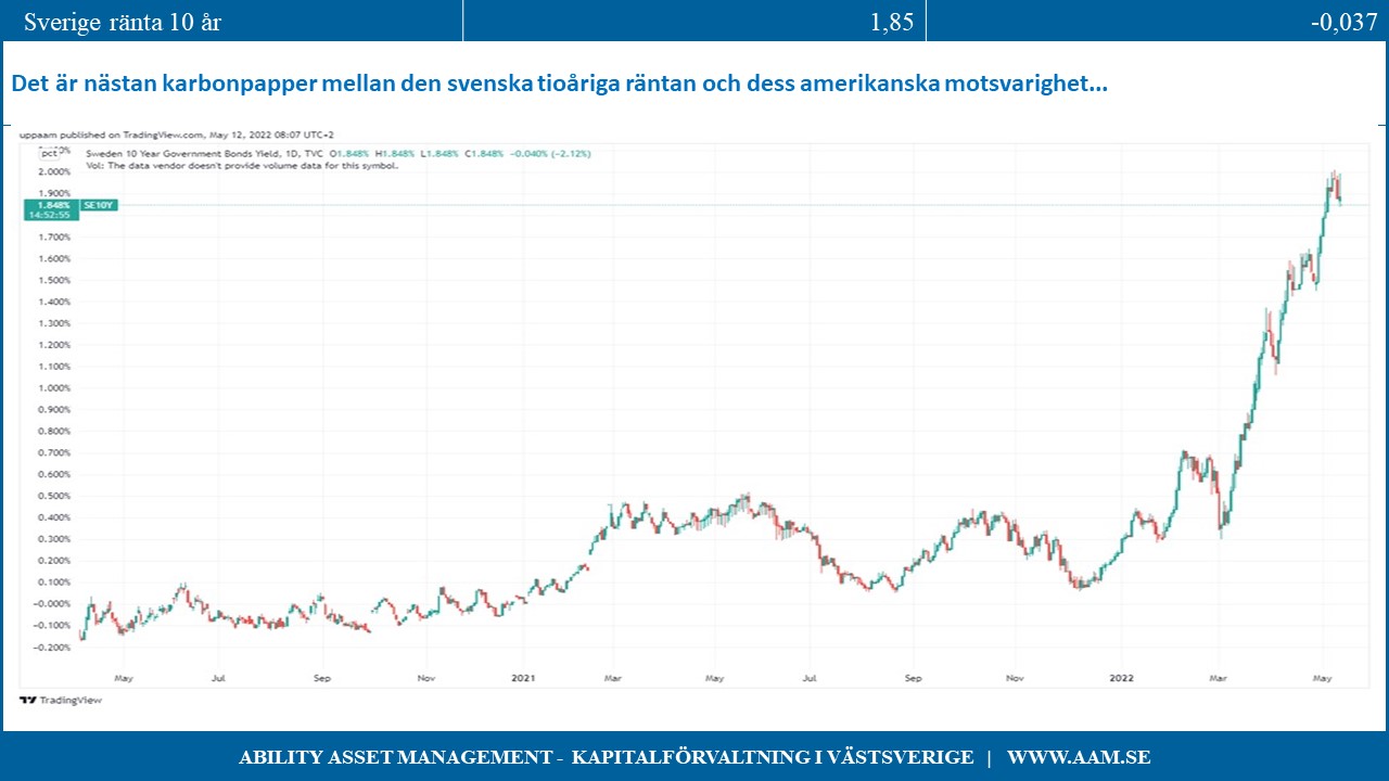 Det är nästan karbonpapper mellan utvecklingen för den svenska tioåriga räntan och dess amerikanska motsvarighet, men hastigheten i uppgången är det facto snäppet värre i Sverige, då vi gått nollränta i december till som mest något över 2% så sent som i måndags. Trots denna synnerligen hastiga uppgång blev reaktionen på de amerikanska inflationssiffrorna initialt större i Sverige än i USA innan en viss tillnyktring skedde.