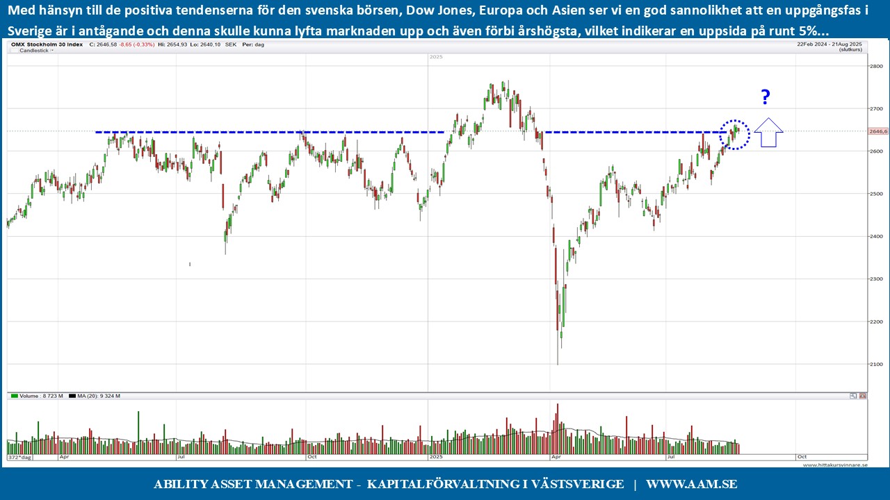 Förutsatt att börsutvecklingen på Nasdaq inte utmynnar i en kännbar rekyl för hela den amerikanska marknaden, så ser vi med hänsyn till de positiva tendenserna för den svenska börsen, Dow Jones, Europa och Asien en god sannolikhet att en uppgångsfas i Sverige är i antågande och denna skulle kunna lyfta marknaden upp och även förbi årshögsta, vilket indikerar en uppsida på runt 5%.