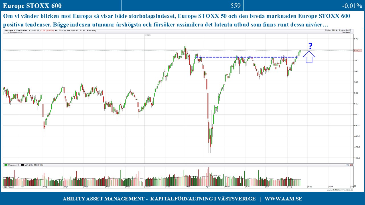 Om vi vänder blicken mot Europa så visar både storbolagsindexet, Europe STOXX 50 och den breda marknaden Europe STOXX 600 positiva tendenser. Bägge indexen utmanar årshögsta och försöker assimilera det latenta utbud som finns runt dessa nivåer. Europa lär dock som Sverige behöver konsolidera och kraftsamla ytterligare en viss tid innan dessa marknader är mogna för förnyad uppgång.