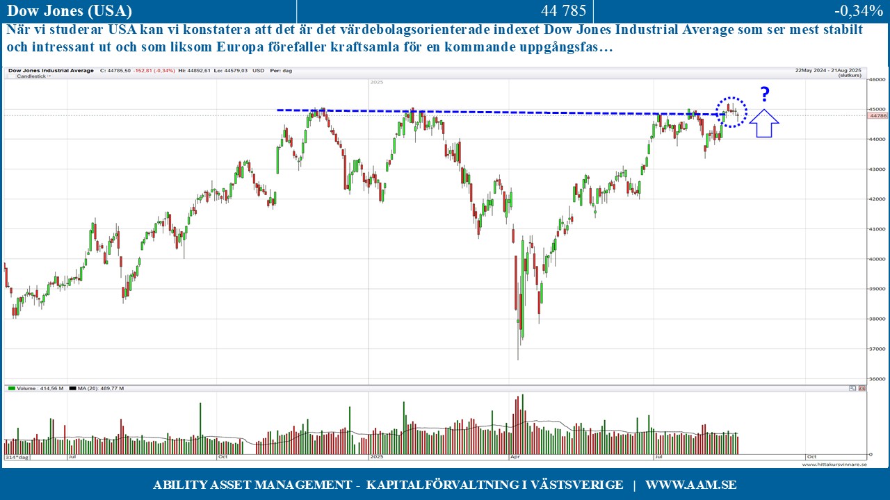 När vi studerar USA kan vi konstatera att det är det värdebolagsorienterade indexet Dow Jones Industrial Average som ser mest stabilt och intressant ut och som liksom Europa förefaller kraftsamla för en kommande uppgångsfas. Nasdaq har visserligen strävat uppåt, men tappat momentum under sommarn, varför det inte är förvånande att denna marknad är i behov av en rekyl med efterföljande stabilisering.