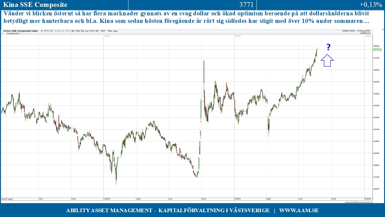 Vänder vi blicken österut så har flera marknader gynnats av en svag dollar och ökad optimism beroende på att dollarskulderna blivit betydligt mer hanterbara och skapat utrymme för ekonomiska stimulanser från centralbankerna. Kina som sedan hösten föregående år rört sig sidledes under hög volatilitet har stigit med över 10% under sommaren och även Hong Kong, Malaysia, Sydkorea, Thailand och inte minst Vietnam har utvecklats positivt. Därtill kan läggas bra utveckling för börserna i både Japan och Australien.