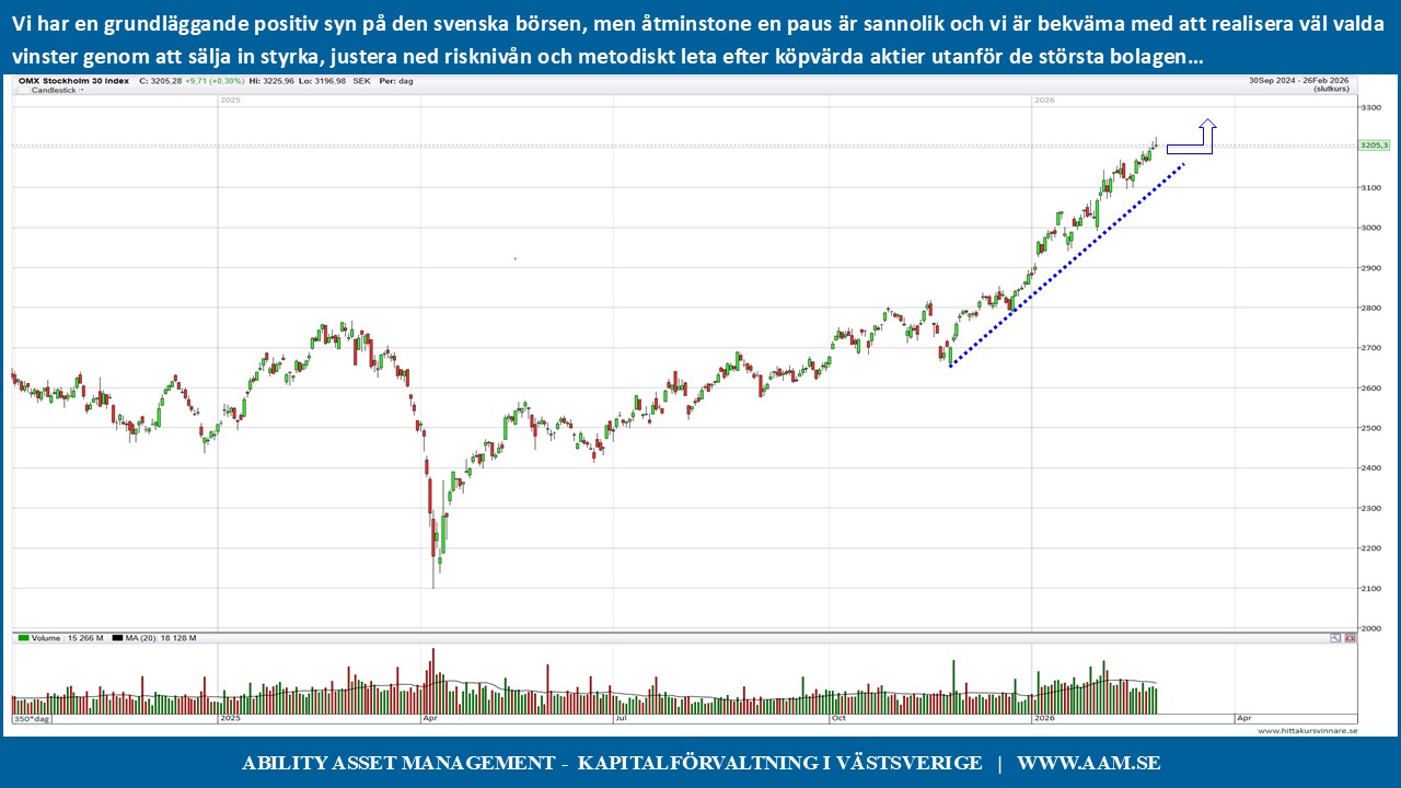 Vi har en grundläggande positiv syn på den svenska börsen, men åtminstone en paus är sannolik och vi är bekväma med att realisera väl valda vinster genom att sälja in styrka, justera ned risknivån och metodiskt leta efter köpvärda aktier utanför de största bolagen.