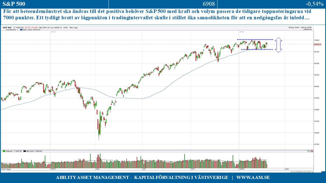 För att beteendemönstret verkligen ska ändras till det positiva behöver S&P 500 med kraft, styrka och volym på allvar utmana och passera de tidigare toppnoteringarna vid 7000 punkter (nu 6908). Ett tydligt brott av lågpunkten i tradingintervallet, dvs. ett fall under 6750 punkter skulle i stället öka sannolikheten för att en nedgångsfas är inledd.