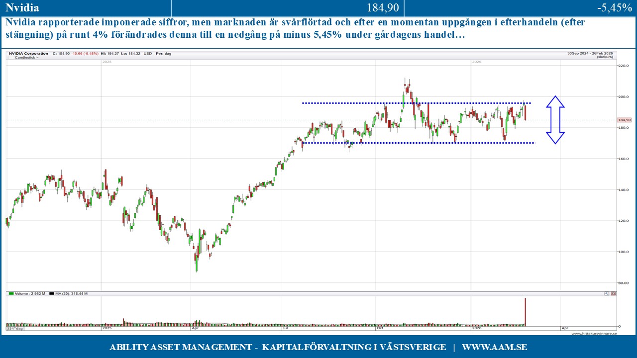 Nvidia rapporterade imponerade siffror, men marknaden är svårflörtad och efter en momentan uppgången i efterhandeln (efter stängning) på runt 4% förändrades denna till en nedgång på minus 5,45% under gårdagens handel. Nedgången för Nvidia påverkade även sektorkollegor som AMD, Broadcom, Intel och Micron negativt med nedgångar på runt 3%.