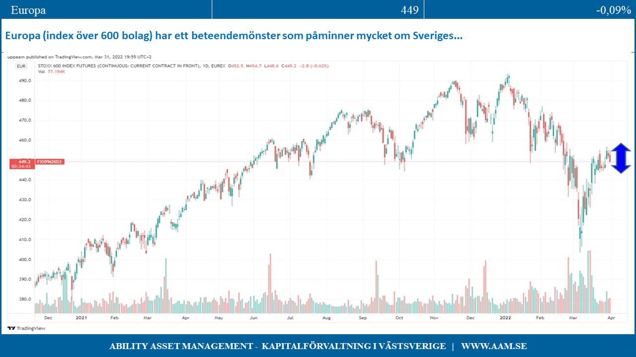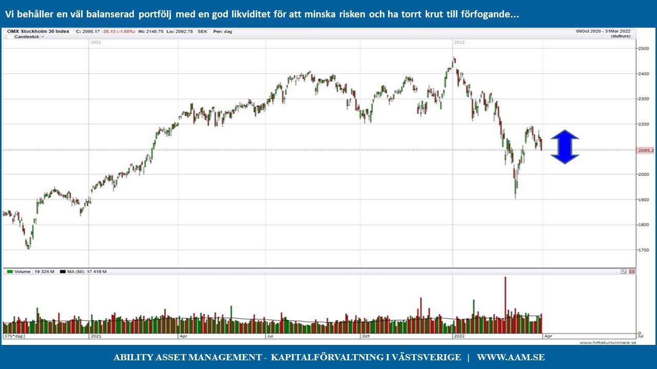 Vi låter de två framgångsrika bolagen H&M och Sinch tjäna som exempel på hur lätt det är att hamna fel i det minfält som råder i den nuvarande och krävande marknadssituationen. Hur pandemins efterverkningar, krigets svåröverskådliga effekter och inflationens påverkan med prishöjningar, leveranstörningar, komponentbrist, räntehöjningar och konjunkturutsikter påverkar det enskilda bolaget är svåranalyserad materia. Årets rapportperiod börjar inte på allvar förrän efter påsk och det är först då som marknaden på allvar kan få en tydligare bild över dessa samverkande faktorer.