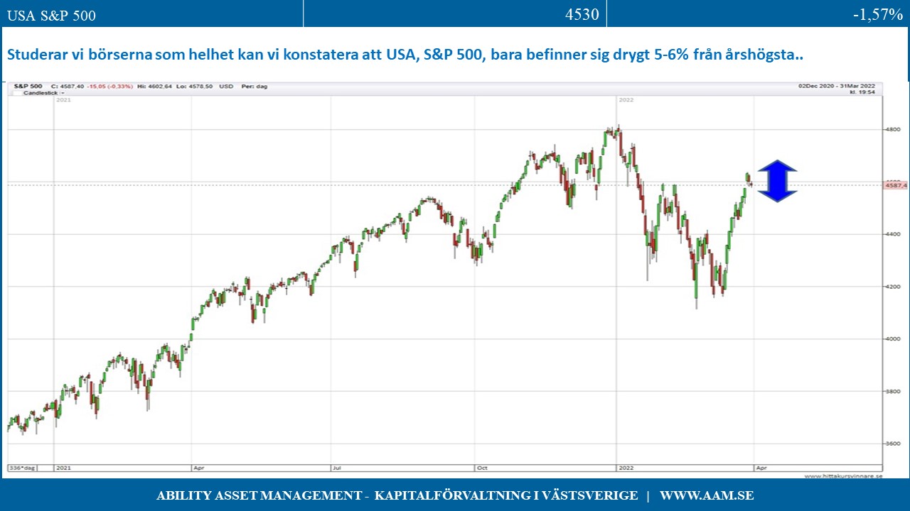 Studerar vi börserna som helhet kan vi konstatera att USA, S&P 500, bara befinner sig drygt 5-6% från årshögsta och har visat en remarkabel motståndskraft. Teknikorienterade Nasdaq har dock mer än dubbla avståndet till årets toppnoteringar, vilket inte är förvånande med denna marknads större räntekänslighet.