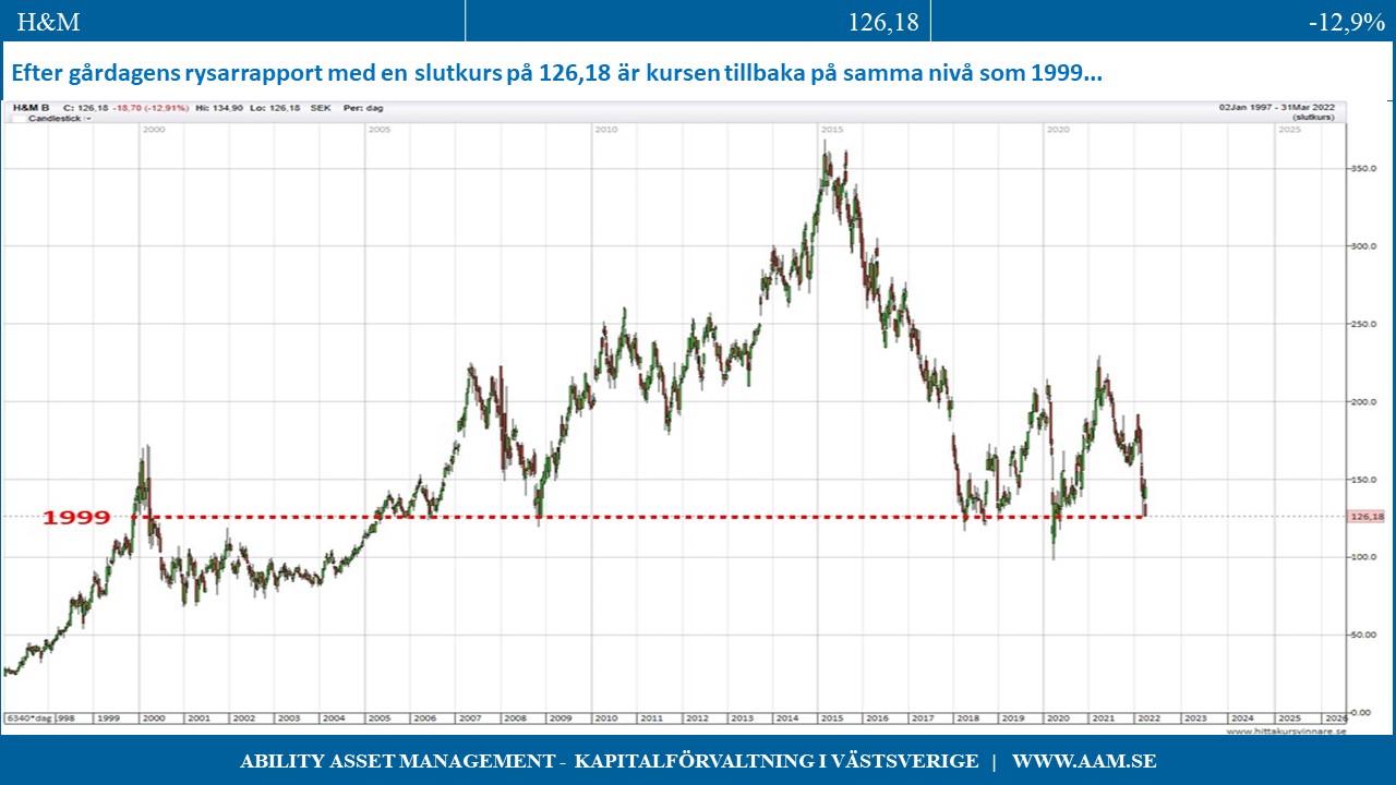 Efter gårdagens rysarrapport med en slutkurs på 126,18 var kursen tillbaka på samma nivå som 1999, dvs. om man köpte aktien för snart 23 år sedan så har man blivit helt utan värdetillväxt. Att H&M efter sju års nedgång skulle publicera en rapport som under utomordentlig hög volym pressade ned kursen med nästan 13% visar att vår tes att marknaden är en plats där det osannolika har en ovanligt hög sannolikhet att inträffa snarast är en underdrift än en överdrift.