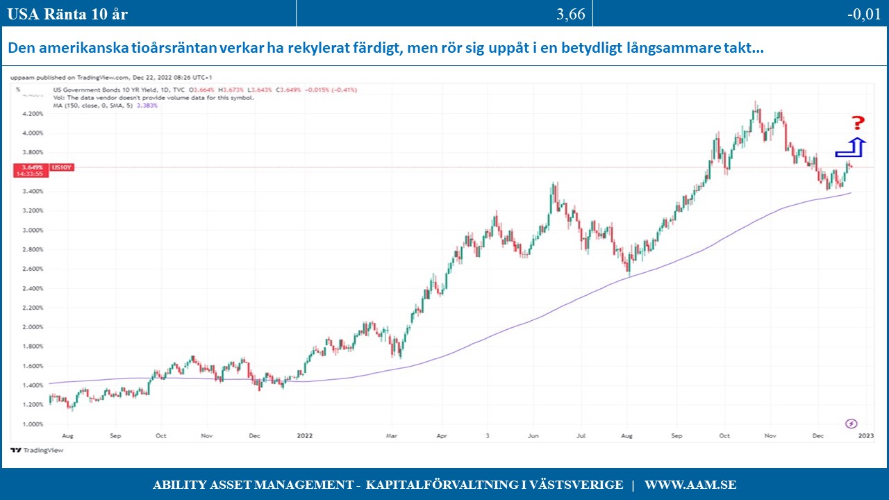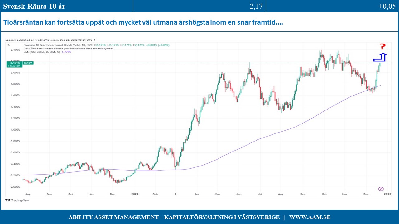 Kortsiktigt har räntan stigit väl snabbt och mycket, blivit överköpt och lär ta en paus och konsolidera. Det förefaller dock sannolikt att tioårsräntan kan fortsätta uppåt och mycket väl utmana årshögsta inom en snar framtid.